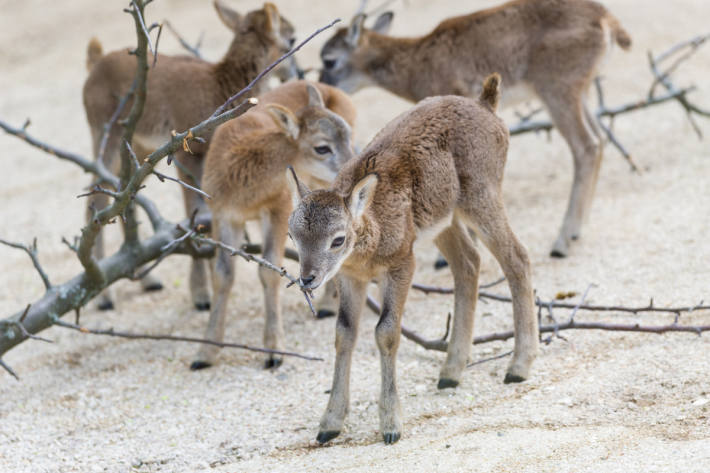 Die fünf entdeckungsfreudigen Mufflon-Kinder sind zwischen dem 15. und 19. April zur Welt gekommen. Flink jagen sie durch das Gehege, während die Mütter laut blökend nach ihnen rufen. Noch tragen die Kleinen ihr Jugendkleid. In wenigen Monaten sind sie bereits selbstständig und das flauschige Fell wird durch ein glattes Haarkleid ersetzt.