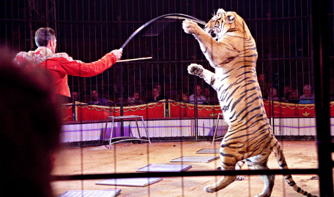 Grazil, muskulös und voller Power. Ein Jäger - gemacht, um den Dschungel von Asien zu durchstreifen, auf Bäume zu springen und im Wasser zu entspannen. Das Bild, das sich in einem Schweizer Zirkus zeigt, ist jedoch weit davon entfernt: Fünf Tiger sitzen auf Hocker umgeben von lauter Musik. In der Mitte gestikuliert ein Dompteur mit Fleischstücken an einem Stock. Unmotiviert führen die Tiger die Kommandos aus.