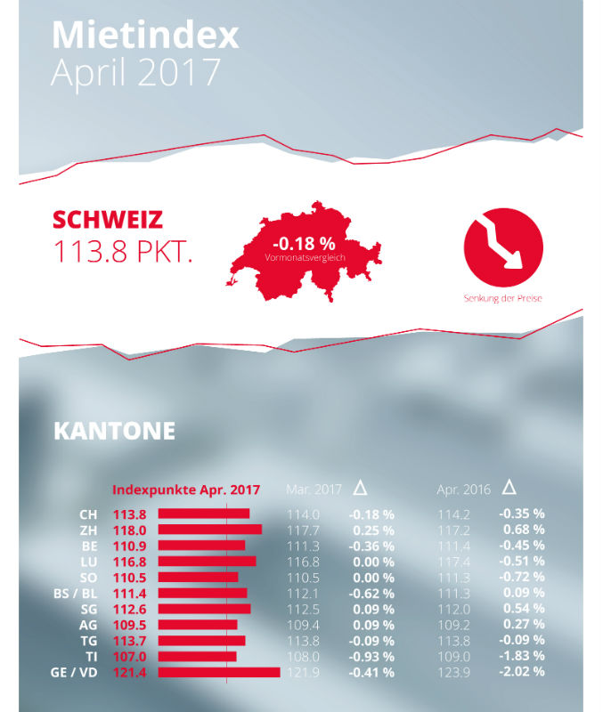 In den Kantonen Luzern und Solothurn bleiben die Mieten unverändert auf dem Indexstand von 116.8 respektive 110,5 Punkten des Vormonats. In den Kantonen Zürich (0,25 Prozent), St. Gallen (0,09 Prozent) und Aargau (0,09 Prozent) steigen die Angebotsmieten im April 2017. Die Kantone Bern (-0,36 Prozent), Basel (-0,62 Prozent), Thurgau (-0,09 Prozent), Tessin (-0,93 Prozent) und Genf und Waadt (-0,41 Prozent) verzeichnen einen leichten Rückgang der Mieten.