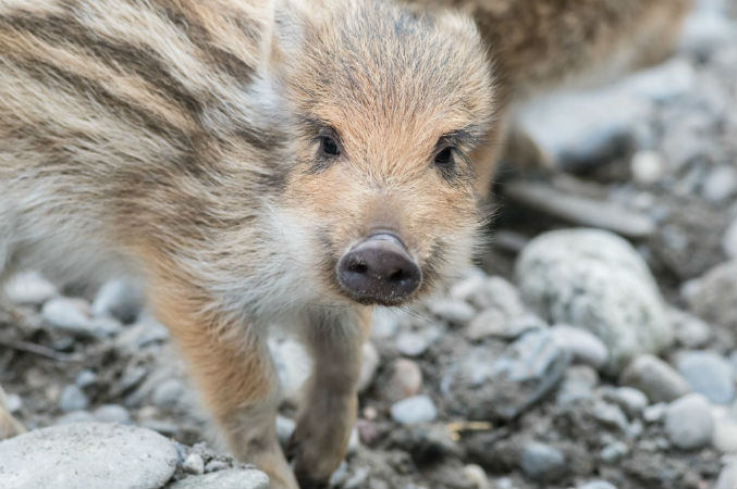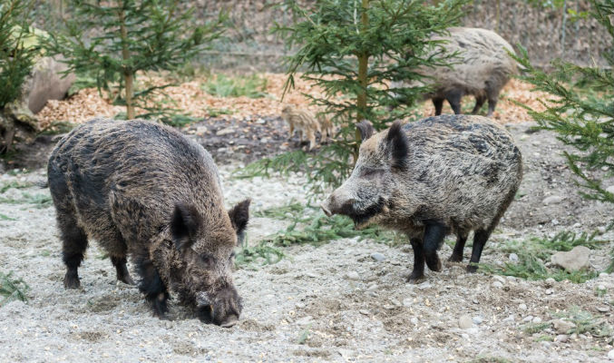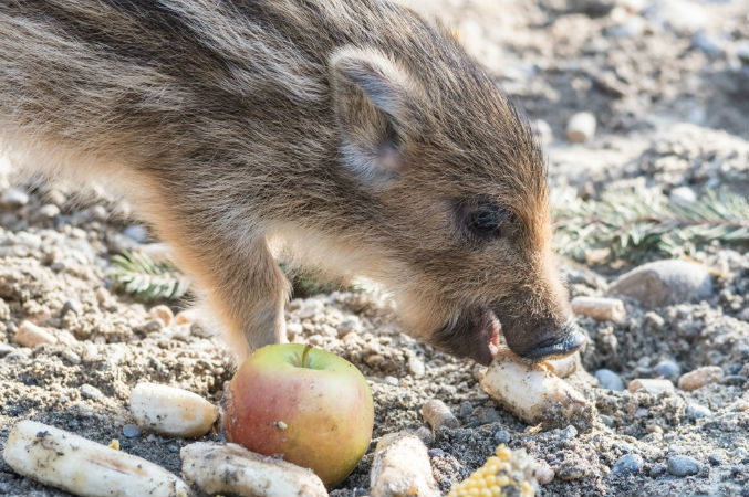 Zurzeit leben sechs Tiere auf der Wildschwein-Anlage: Ein Männchen, zwei Weibchen und drei am 6. Januar geborene Jungtiere. Die gestreiften Frischlinge trippeln jetzt flink zwischen den Bäumchen herum.