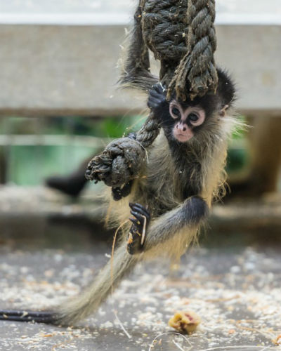 Bis Klammeraffenkinder anfangen die Umgebung zu erkunden, dauert es ein paar Monate. Wenn es dann soweit ist, ist richtig etwas los in der Klammeraffengruppe. Zurzeit liefern sich Orgullo (9 Monate) und Orozco (6 Monate) wilde Verfolgungsspiele. Auch ihre beiden gut ein Jahr älteren Halbbrüder Nestor und Norbert mischen fleissig mit. Anführer der Rasselbande ist Kasik (4).