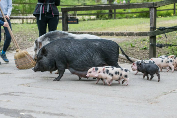 Nera und Nino sind zwar noch jung, aber bereits erfahrene Minipig-Eltern. Der aktuelle Wurf ist bereits ihr fünfter. Die ersten zwei bis drei Wochen verbrachte Nera mit ihren Jungen im Stall. Seit einigen Tagen sind die zwei schwarzen und sechs gescheckten Jungen alt genug, um den Ausflug ins Freie zu wagen.