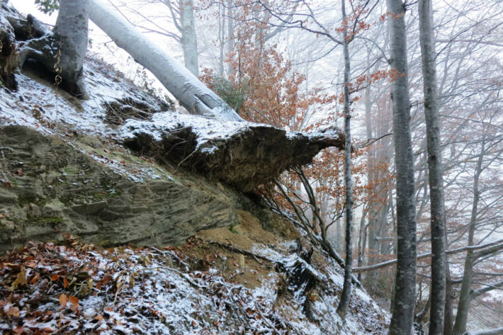 Am 30. Oktober letzten Jahres fegte das Tief Vaia mit Sturmböen von teilweise über 100 km/h über das Appenzellerland und verursachte im Wald stellenweise grosse Schäden. In einem kleinen Stück Wald im Gebiet Schwendi in Teufen haben die Böen mehrere schwere Buchen samt den Wurzeltellern umgeworfen. Der Wald stockt dort an einem sehr steilen Hang, der von einem Sandstein-Felsband durchzogen ist. Die umgestürzten Bäume haben die Felsoberfläche teilweise freigelegt.