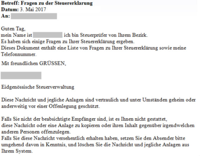 In den letzten Wochen haben Betrüger vermehrt E-Mails versandt, die angeblich von der Eidgenössischen Steuerverwaltung (ESTV) stammen. Dabei wird auf eine fiktive Steuerrückerstattung Bezug genommen, welche man durch Ausfüllen eines angehängten Dokumentes erhalten soll.