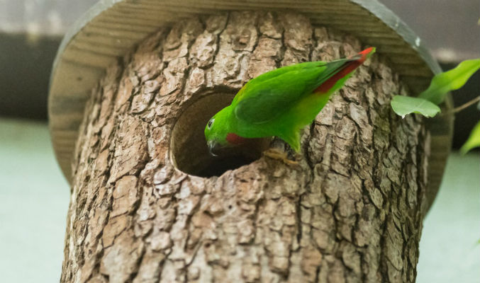 Zur Übergabe des Futters ruft das Männchen vor der Nisthöhle nach seiner Partnerin. Die Leckerbissen übergibt er ihr erst, wenn sie aus der Höhle geschlüpft ist. Manchmal drehen beide vorher zusammen noch ein paar Flugrunden in der Halle. Zurzeit scheint der Vogel-Casanova mit der Mehrfachbelastung gut klar zu kommen. Richtig anstrengend wird es wohl, wenn der Nachwuchs schlüpft und es noch mehr hungrige Mäuler zu stopfen gibt.