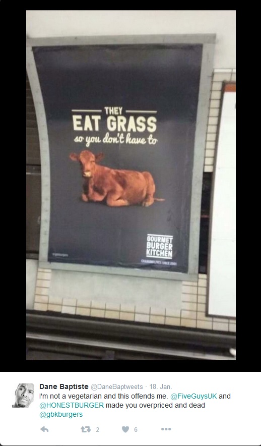Die britische Burgerkette Gourmet Burger Kitchen (GBK) hat sich mit ihrer aktuellen Plakat-Kampagne in der Londoner U-Bahn den Unmut zahlreicher Vegetarier zugezogen. Slogans wie "Du wirst dich immer an den Moment erinnern, als du aufgegeben hast, Vegetarier zu sein" oder das Bildnis einer Kuh mit den Worten "Sie essen Gras, also musst du das nicht tun" lösten eine Welle der Empörung in sozialen Netzwerken aus. Daraufhin hat sich GBK für die Werbung nun offiziell entschuldigt.