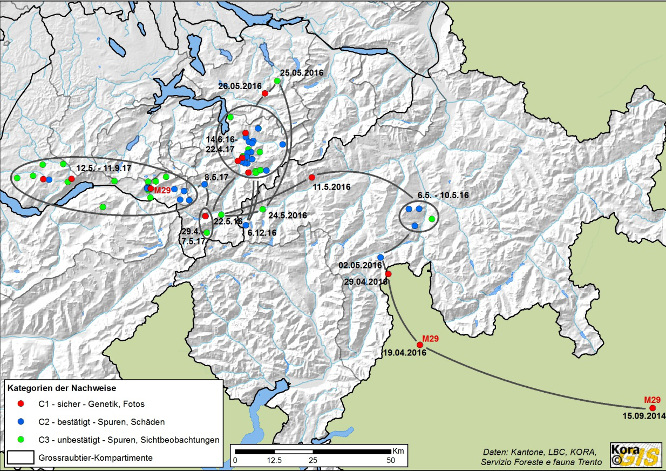 Am 14. Mai 2017 wurden Spuren auf dem Susten-, am 23. Mai 2017 auf dem Grünenbergpass gefunden, wo M29 am 26. Mai 2017 auch beobachtet und fotografiert werden konnte. Neben mehreren Hinweisen und einem genetischen Nachweis im Gental gelang eine spektakuläre Beobachtung, als M29 auf dem Gletscher des Sustenhorns beobachtet wurde und in der Nähe der Tierberglihütte Spuren hinterliess.