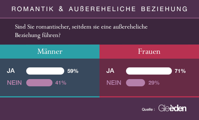 Kann eine aussereheliche Beziehung einen Einfluss über das eigene romantische Benehmen haben? Tatsächlich ja! 71 Prozent der befragten Frauen und 59 Prozent der Männer sind romantischer, sowohl zu ihrem offiziellen Partner als auch zu ihrem/ihrer Liebhaber/-in, wenn sie ein untreues Verhältnis führen.