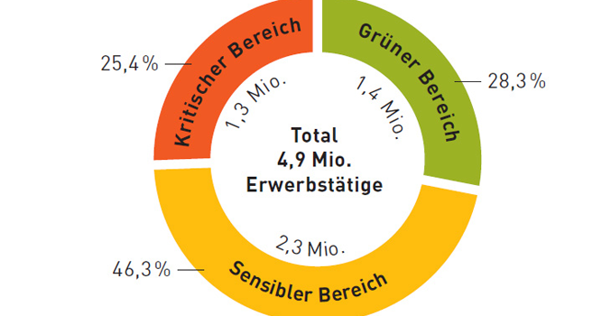 Die Erhebung 2016 zeigt, dass ein Viertel aller Erwerbstätigen über zu wenig Ressourcen verfügt, um die hohen Belastungen am Arbeitsplatz abfedern zu können. Ressourcen beschreiben die Möglichkeiten, auf ein Ungleichgewicht zwischen Belastung und Anforderung zu reagieren. Fast die Hälfte der Erwerbstätigen (46,3 %) befindet sich demnach im "sensiblen Bereich". In diesem Bereich reichen vorhandene Ressourcen nur knapp aus, um die aktuellen Belastungen auszugleichen.