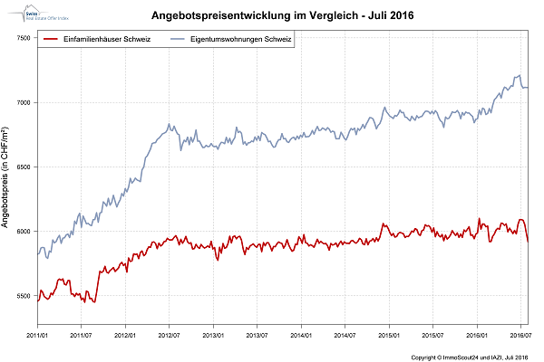 Im vergangenen Monat zeigt der von "ImmoScout24" in Zusammenarbeit mit dem Immobilien-Beratungsunternehmen IAZI AG errechnete "Swiss Real Estate Offer Index" in allen Objektkategorien nach unten, am deutlichsten bei den Einfamilienhäusern. Hier liegt das mittlere Preisniveau für einen Quadratmeter Nettowohnfläche aktuell (Stand Ende Juli) bei 5'940 Franken, was einem Minus von 3,1 Prozent gegenüber Juni 2016 entspricht. Auf Jahresbasis beträgt der Rückgang 0,3 Prozent.
