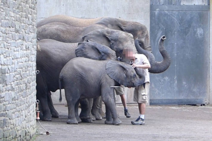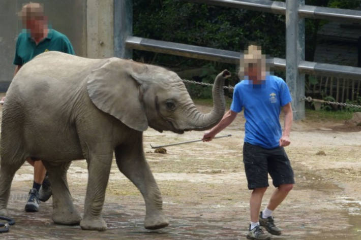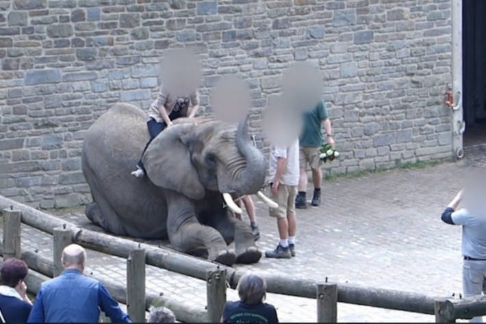Mit Sonderveranstaltungen wie Trauungen oder privaten Führungen im Elefantenhaus generiert der Zoo zusätzliche Einnahmen, vermutlich, um dem starken Besucherrückgang entgegenzuwirken. Die sensiblen Tiere werden gezwungen, für Fotoaufnahmen mit erhobenem Rüssel zu posieren. Ein Elefant musste sogar eine Besucherin auf sich reiten lassen. Im Video ist zudem zu sehen, wie sich ein Wärter zum Vergnügen an den Stosszähnen hochziehen lässt. Der Zoo Wuppertal nimmt enorme Risiken in Kauf, etwa durch Unfälle oder eine mögliche Krankheitsübertragung. Schwere Verletzungen und sogar Todesfälle von Zoowärtern durch Elefanten in deutschen Zoos sind dutzendfach dokumentiert . Zudem können Elefanten namhaften Experten zufolge nicht ohne Gewalt und Zwang dressiert werden. Das Video zeigt, wie den Rüsseltieren der Elefantenhaken wiederholt in die sensible Haut gestossen wird. Auch beim regelmässigen Abduschen müssen die Elefanten den Stock mit dem spitzen Metallhaken fürchten, wenn sie nicht sofort reagieren. Schon Babyelefant Tuffi wird diesem psychischen Stress ausgesetzt.