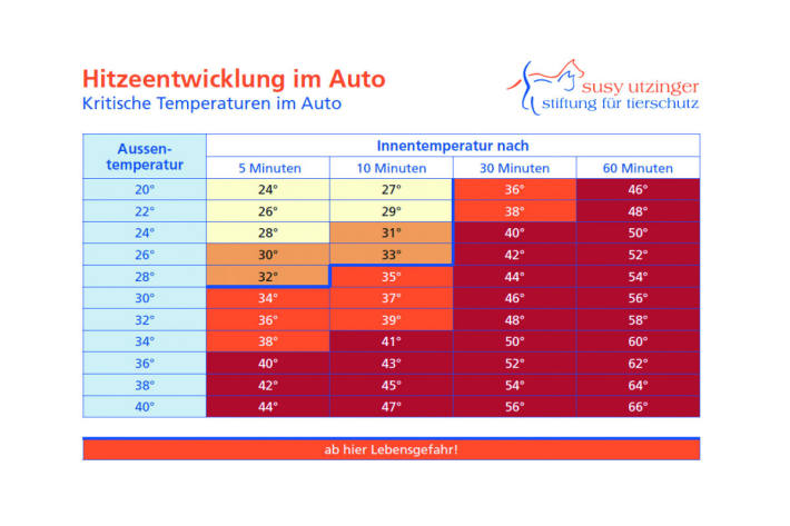 Es ist eine tödliche Gefahr, die oft unterschätzt wird: Bereits bei milden 15 Grad Aussentemperatur heizt sich der Innenraum eines ungeschützt parkierten Autos auf 50 Grad und mehr auf. Auch Autos, die gerade noch im Schatten standen, können nach einiger Zeit von der Sonne erfasst und so zur Todesfalle für den darin eingesperrten Hund werden. Ein spaltbreit geöffnetes Fenster leistet keinerlei Abkühlung. Innerhalb kürzester Zeit erleidet der Vierbeiner einen Hitzschlag, der leider oft tödlich endet.