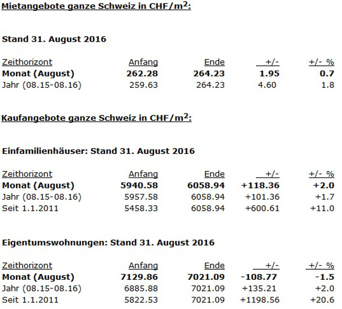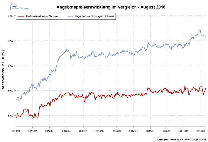 Nachdem die Angebotspreise für Eigentumswohnungen im ersten Halbjahr 2016 kontinuierlich gestiegen sind, weist der von "ImmoScout24" in Zusammenarbeit mit dem Immobilien-Beratungsunternehmen "IAZI AG" erhobene "Swiss Real Estate Offer Index" seit Juli eine rückläufige Tendenz bei den Preisen für Stockwerkeigentum aus. Nach einem moderaten Rückgang von 0,4 Prozent im Juli lässt sich im August ein Abschlag von 1,5 Prozent beobachten. Im landesweiten Mittel wird der Quadratmeter Nettowohnfläche für Eigentumswohnungen nunmehr für 7'021 Franken angeboten.