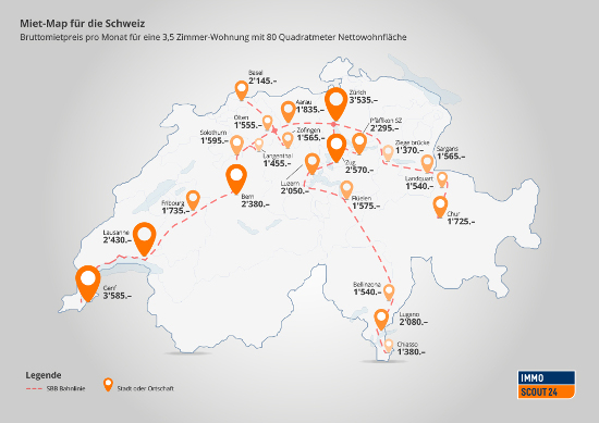 Für die Auswertung hat "ImmoScout24" zusammen mit dem Immobilienberatungsunternehmen IAZI AG untersucht, wie hoch die monatliche Bruttomiete einer durchschnittlichen 3,5 Zimmer-Wohnung* an über 20 ausgewählten Schweizer Ortschaften und Städten im Schienennetz der SBB ist.