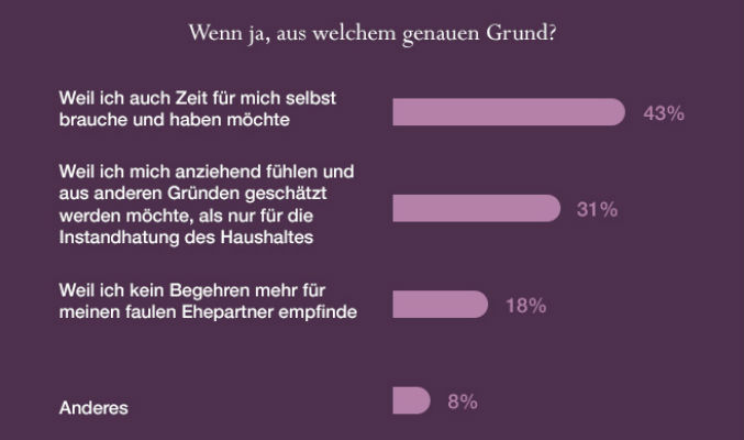 Die Lust, sich einmal eine Auszeit zu gönnen, weil sich ihr Ehemann zu wenig in den Haushaltsaufgaben involviert, ist der von 43 Prozent der weiblichen Gleeden-Mitglieder angegebene Grund, um ihre Untreue zu rechtfertigen. Andere befragte Frauen (31%) erwähnen ein Bedürfnis, an ihre Weiblichkeit wieder anzuknüpfen, sich begehrenswert und geschätzt zu fühlen. Und dies abgesehen von ihren Talenten als Hausfrau! Schliesslich erklären 18 Prozent von ihnen, die Anziehung zu ihrem Ehepartner verloren zu haben, weil dieser im Haushalt nicht mithilft.