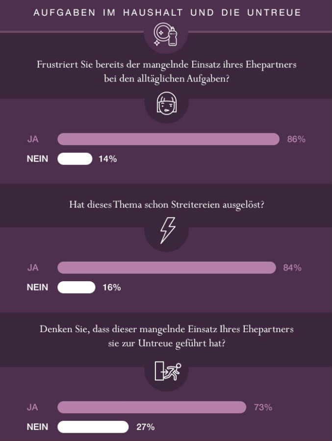 Laut der Antworten von über 10'000 Frauen, registriert bei Gleeden, der ausserehelichen Vermittlungsseite mit mehr als 3 Millionen Mitgliedern, habe dieses Streitthema eine direkte Verbindung mit Seitensprüngen und der Untreue bei Frauen. 86 Prozent von ihnen geben umunwunden zu, sich bereits über den mangelnden Einsatz ihrer Ehemänner in den Haushalt geärgert zu haben. 84 Prozent von ihnen geben sogar an, sich darüber schon gestritten zu haben. Schliesslich denken circa drei Viertel von ihnen (73%), dass dieses schlampige Verhalten ihres Mannes sie in die Arme eines Anderen getrieben hat.