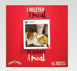 Im Rahmen der "The Delete to Feed"-Kampagne löschen Instagram-User eines ihrer Essensbilder und spenden somit elf Bedürftigen jeweils eine Mahlzeit. Initiiert wurde das Projekt von der Non-Profit-Organisation Feeding America und der US-Agrargenossenschaft Land O'Lakes.