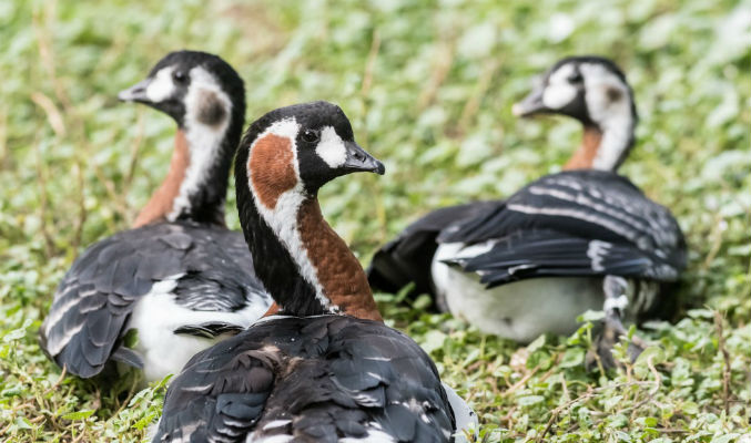 Nicht nur im Zoo, auch in der Natur sind Rothalsgänse gern in Gesellschaft. Merkwürdigerweise suchen sie zum Brüten die Nähe von Falkennestern. Etwas seltener sieht man sie in Kolonien von Eis- oder Silbermöwen. Im Umkreis von Falken den Nachwuchs aufzuziehen erweist sich auf den zweiten Blick als sehr clever: Denn diese Raubvögel jagen nie in unmittelbarer Nähe ihres eigenen Nestes, vertreiben aber jeden Feind aus dem Brutgebiet, auch den Polarfuchs, der sich gerne an die Rothalsgansküken heranmacht.