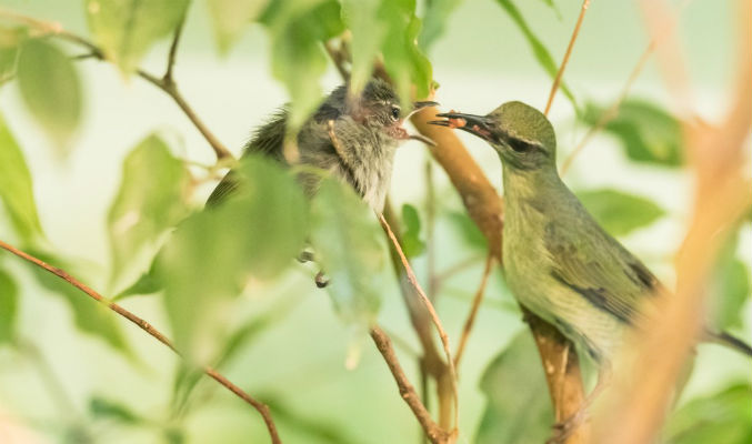 Die Zucht von Türkisnaschvögeln ist nicht einfach. Ihre Nester bauen sie in der Natur aus Spinnweben und die Jungen füttern sie am Anfang mit winzig kleinen Insekten. Im Zoo Basel wurden den Eltern Tierhaare zum Nestbau und kleinste Drosophila Fliegen angeboten. Das hat bestens geklappt.