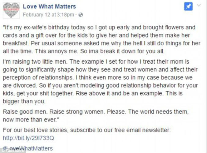 "Heute ist der Geburtstag meiner Exfrau, deswegen bin ich früh aufgestanden und habe Blumen und Karten und ein Geschenk rüber gebracht, das die Kinder ihr geben sollen und ich habe ihnen geholfen für sie Frühstück herzurichten. Wie gewöhnlich hat mich jemand gefragt, warum zur Hölle ich all das immer noch für sie tue. Das nervt mich. Deswegen will ich es für euch alle klarstellen. Ich ziehe zwei Jungs gross. Das Beispiel, wie ich ihre Mutter behandle, wird die Art und Weise wie sie Frauen ansehen und behandeln sowie ihre Sicht auf eine Beziehung beeinflussen. Ich glaube, dass dies durch unsere Trennung sogar noch verstärkt wird. Wenn ihr euren Kindern nicht zeigt, wie man in einer Beziehung miteinander umgeht, dann reisst euch von jetzt an mal zusammen. Steht drüber und seid ein gutes Beispiel. Das hier ist grösser als ihr selbst. Zieht gute Männer gross. Zieht starke Frauen gross. Bitte. Die Welt braucht sie mehr denn je."