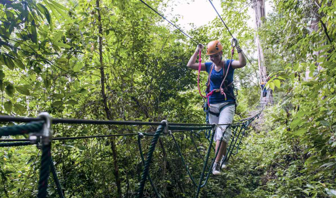 Für diejenigen, die ohne ein motorisiertes Luftfahrzeug einen Blick von oben auf die Insel werfen möchten, die können den SkyTrex Kletterpark an der Westküste der Insel ausprobieren und sich über schwebende Treppen und hängende Seile zwischen den Baumwipfeln des Regenwaldes ihren Weg bahnen.