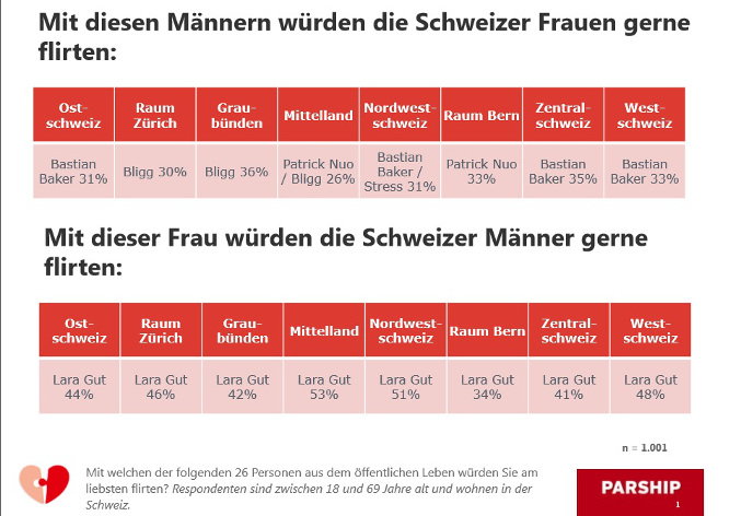 Zwar bringt niemand die Zürcherinnen so in Flirtlaune wie Bligg und auch bei den Mittelländerinnen teilt er sich den ersten Platz mit Patrick Nuo, doch Gesamtschweizerisch belegt er nur den dritten Platz. Everybody's Darling Roger Federer ist dafür bei den Bernerinnen genauso beliebt wie Bastian Baker, landet aber schweizweit nur auf dem 5. Platz der beliebtesten Flirts.