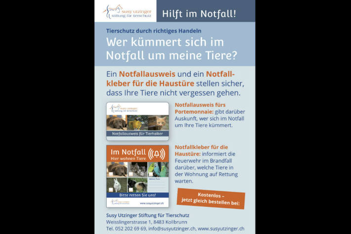 Hinweiskleber und Notfallausweise können kostenlos im WebShop der Susy Utzinger Stiftung für Tierschutz bezogen werden: www.susyutzinger.ch/Shop