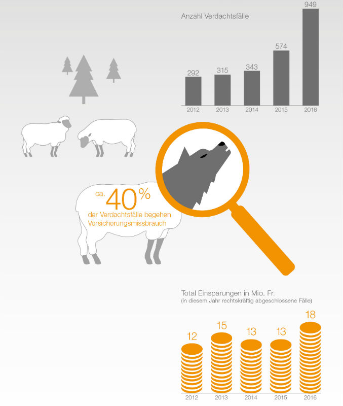 Null Toleranz bei Versicherungsmissbrauch: 2016 verhinderte die Suva ungerechtfertigte Leistungsbezüge von rund 18 Millionen Franken. Das sind 5 Millionen Franken mehr als in den beiden Vorjahren (vergleiche Infografik). Dafür hat sie 949 Verdachtsfälle untersucht (+375).