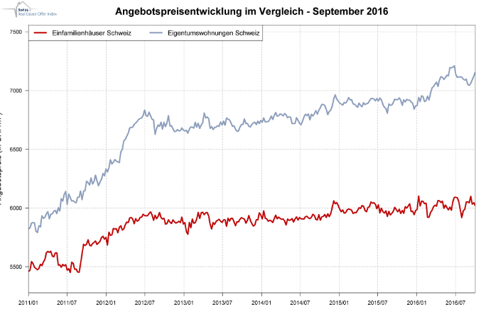 Einfamilienhäuser notierten im September auf einem mittleren Angebotspreis von 6'020 Franken pro Quadratmeter Nettowohnfläche und damit um 0,6 Prozent tiefer als im Vormonat August. Schweizweit ergibt sich auf Jahresbasis dennoch ein moderater Zuwachs von 0,6 Prozent, was für eine weitere Beruhigung des Marktes für Einfamilienhäuser spricht.