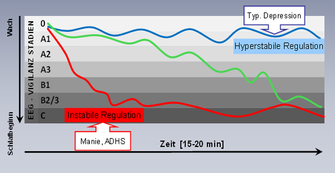 Schematische Veranschaulichung der drei prototypischen Arousalregulationstypen und ihr Zusammenhang mit psychischen Störungen. Bei geschlossenen Augen ohne Aussenreize zeigt sich meist ein langsamer Abfall des Arousals (mittlere Kurve). Andere Personen zeigen hingegen einen sehr schnellen Abfall des Arousals schon kurz nach Beginn der EEG-Messung. Aufgrund verschiedenartiger Befunde eines Hypoarousals bei ADHS und Manie kann eine solche instabile Arousalregulation bei Subgruppen dieser Störungen angenommen werden. Im Gegensatz dazu zeigen Personen mit einer hyperstabilen Arousalregulation auch nach langer Zeit noch keinen Abfall. Eine hyperstabile Arousalregulation wurde mit dem VIGALL bei typischer Depression gefunden – in Einklang mit anderen Befunden zu Insomnie und Hyperarousal bei Depression.