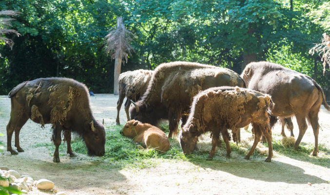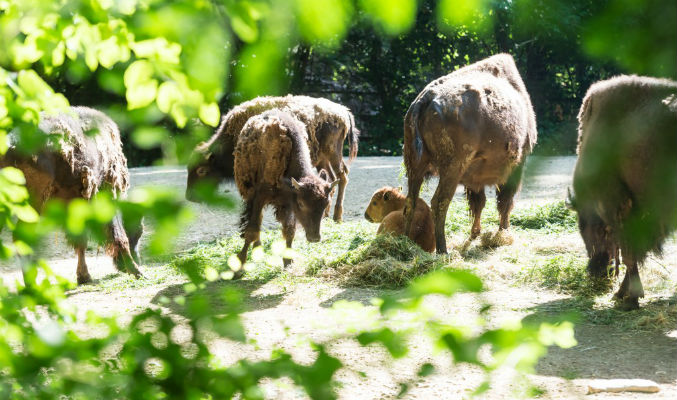 Unter den letzten Fetzen "Wintermantel" zeigt sich bei den Amerikanischen Bisons im Zoo Basel jetzt das glatte Sommerfell. Inmitten der zerzausten Erwachsenen ist ein hell gefärbtes Kälbchen zu sehen. Das Junge wurde nach der Geburt - wie bei Bisons üblich - stürmisch von allen Herdenmitgliedern begrüsst.