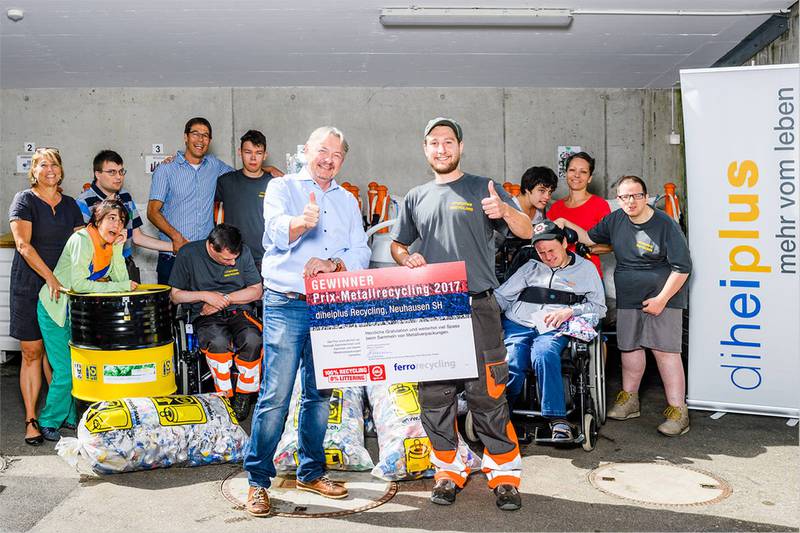 Bei der Stiftung diheiplus in Neuhausen ist Sammeln und Rezyklieren in die Tagesstruktur sinnvoll integriert. Am neuen Standort „WerTstatt“ sind rund 10 Klienten, die im Recyclingteam begeistert arbeiten. Vor rund 4 Jahren startete Matthias Lüchinger, ein langjähriger Mitarbeiter der Tagesstruktur, mit der Idee, einen Recyclingservice aufzubauen. Angefangen hat es damals mit ein paar wenigen Interessenten.Heute beanspruchen diese Dienstleistung über 105 Kunden - diverse Privathaushalte im Raum Neuhausen und Umgebung sowie Schulhäuser und Restaurants. Für ein Jahresabo von 95 Franken holt dieheiplus einmal pro Woche die gesammelten Wertstoffe wie Nespresso-Kapseln, Altglas, Alu, Metall und PET bei den Kunden ab. Diheiplus sortiert die Ware und bringt sie zur Wiederverwertung in einen Recyclingbetrieb in der Nähe. Für Metallverpackungen bietet die Organisation zusätzlich selbst gestaltete Fässer an, welche in Badeanstalten und zunehmend auch an Events zum Sammeln von leer getrunkenen Aludosen dienen. Das umsichtige Sammeln von diheiplus ist vorbildlich. Im letzten Jahr hat die Organisation neben vielen anderen Wertstoffen bereits mehr als 400 Kilo Aludosen wiederverwertet. Laut Matthias Lüchinger wird das Projekt sukzessive ausgebaut, damit langfristig der Recyclingservice sichergestellt ist. Die Klienten von diheiplus seien äusserst motiviert im Sammeln und Sortieren der Wertstoffe.