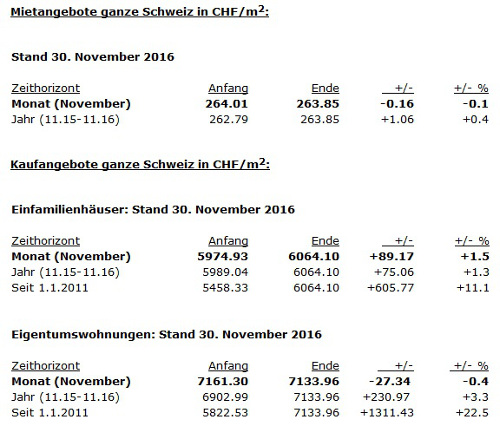Die Angebotsmieten haben sich im vergangenen Monat November mit einem leichten Minus von 0,1 Prozent kaum verändert. Waren die ersten Sommermonate von eher nachgebenden Werten geprägt, verzeichnete der Swiss Real Estate Offer Index bei den Angebotsmieten zuletzt im Oktober noch einen leichten Anstieg (infoticker.ch berichtete).