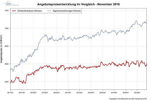 Im November haben die Preise für Eigentumswohnungen um 0,4 Prozent nachgegeben - der Quadratmeter Nettowohnfläche kostet in dieser Objektkategorie aktuell 7'135 Franken. Stockwerkeigentum ist damit seit August zum ersten Mal wieder günstiger geworden. Nach wie vor positiv ist die Veränderung auf Jahresbasis (+3,3 Prozent).