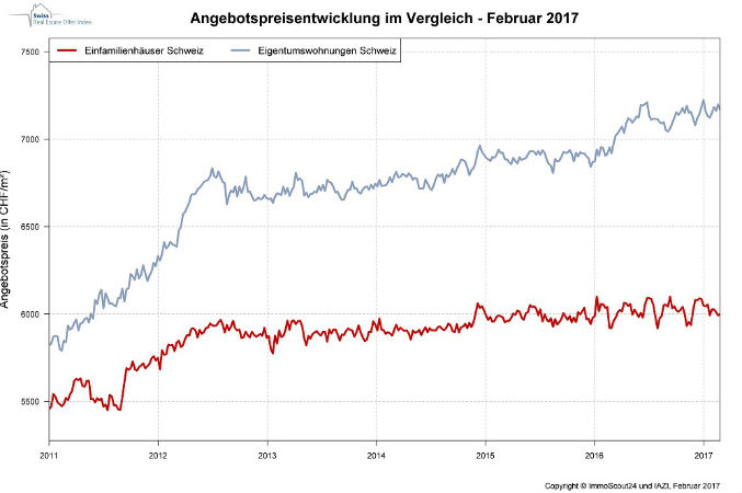 Das Plus von 0,3 Prozent bei den Preisen für Eigentumswohnungen im vergangenen Monat gleicht den noch im Januar notierten Rückgang nahezu wieder aus. Damit verharrt der durchschnittliche Preis pro Quadratmeter Nettowohnfläche in diesem Immobiliensegment seit April 2016 knapp unter 7200 Franken. Die Betrachtung auf Jahresbasis zeigt einen Anstieg von 3,7 Prozent.