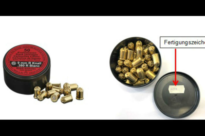 Konsumenten im Besitz von Platz- und Knallpatronen "GECO 9 mm R Knall (Nitro RB)" sind gebeten, anhand des Fertigungszeichens zu prüfen, ob sie betroffen sind. Die betroffenen Konsumenten erhalten bei ihrem Waffenfachhändler kostenlos Ersatz oder den Kaufpreis rückerstattet.