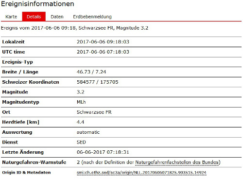 Der Schweizerische Erdbebendienst an der ETH Zürich hat im Kanton Freiburg, 9 km nordwestlich von Schwarzsee ein Erdbeben registriert.