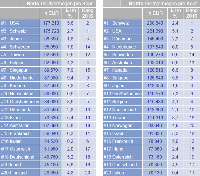 Es waren allerdings nicht die hohen Verbindlichkeiten, sondern das relativ verhaltene Vermö-genswachstum, das die Schweiz vom ersten Platz der Rangliste der 20 reichsten Länder (Geldvermögen pro Kopf; s. Tabelle im Anhang) stiess: Erstmals standen 2016 die USA an der Spitze, Folge der Jahresendrallye an den dortigen Börsen (und eines starken US Dollars).