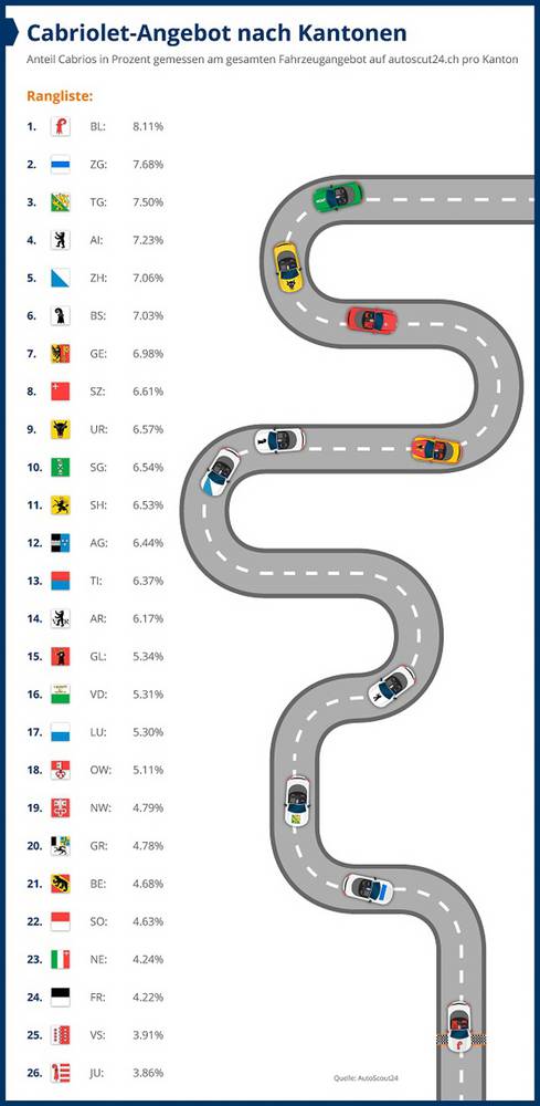 Auch in den flächenmässig grossen Kantonen Graubünden (4,8 Prozent), Bern (4,7 Prozent) und Wallis (3,9 Prozent) stehen vergleichsweise wenig Cabriolets zum Verkauf. Hier könnte die Topographie eine Rolle spielen. In diesen Kantonen werden gemäss Aebi eher geländegängige Limousinen oder Kombis als Zweitwagen nachgefragt.