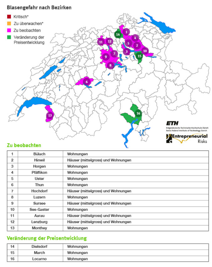 Im Gegensatz zum letztjährigen Bericht wurden in keinem Bezirk deutliche Anzeichen einer Immobilienblase festgestellt - es wurden keine Bezirke als "kritisch" oder "zu überwachen" eingestuft. Erstmalig wurden aber 13 Bezirke als "zu beobachten" eingestuft. Besonders aufgefallen waren letztes Jahr Bülach, Thun, Luzern, Sursee und Aarau, weil sich der Markt dort regional leicht erhitzt hatte.