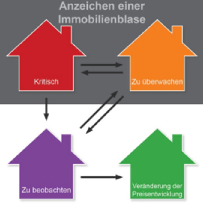 Bei der Risikoanalyse unterscheidet der Immobilienreport vier Zustände von Bezirken, wobei ein Bezirk je nach Anzeichen einer Immobilienblase und je nach Datengrundlage von einem Zustand in einen anderen wechseln kann (siehe Methode). Dabei erlaubt der Report Aussagen zu einzelnen Typen und Grössen von Immobilien, zum Beispiel zu kleinen Wohnungen oder mittelgrossen Häusern. Das Modell dieser Studie beruht nicht auf den absoluten Preisen, sondern auf der Preisdynamik und besonders auf einem Preisanstieg, der schneller als exponentiell verläuft.