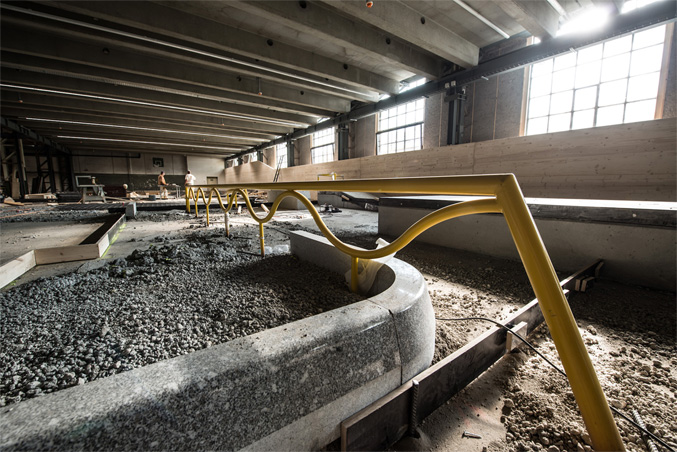 Die Architektin Valérie Waibel, welche für die Sanierung und die Umgestaltung des Rohbaus beauftragt worden ist, lässt den nostalgischen Industriecharakter der einstigen Sulzer-Fabrik bestehen: In den ehemaligen Büroräumlichkeiten der früheren Sulzer-Produktionshalle, entstehen die Garderoben. Die alten Metalltreppen führen die Besucher nun neuplatziert über drei Geschosse.