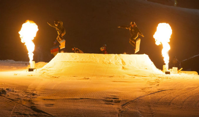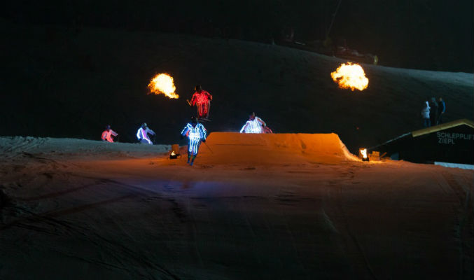 Günther Gold begeistert mit einem eindrucksvollen Nachtflugprogramm. Eine bunte Lasershow umrahmt das Programm der Skishow. Für ein weiteres Highlight des Abends sorgt das Pistenbully-Ballett der Bergbahn Westendorf.