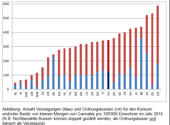 So wird ein freiburgischer Cannabiskonsumierender oft nicht gleich behandelt wie einer im Kanton Bern, vor allem wenn er nur im Besitz von Cannabis ist. Ein Einwohner des Kantons Baselland läuft deutlich weniger Gefahr, für den Konsum von Cannabis bestraft zu werden, als sein Nachbar im Kanton Aargau, und im Wallis hat sich die Anzahl geahndeter Widerhandlungen seit der Einführung des OBV verdoppelt, wogegen die Zunahme in der ganzen Schweiz viel gemässigter ausfällt.