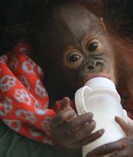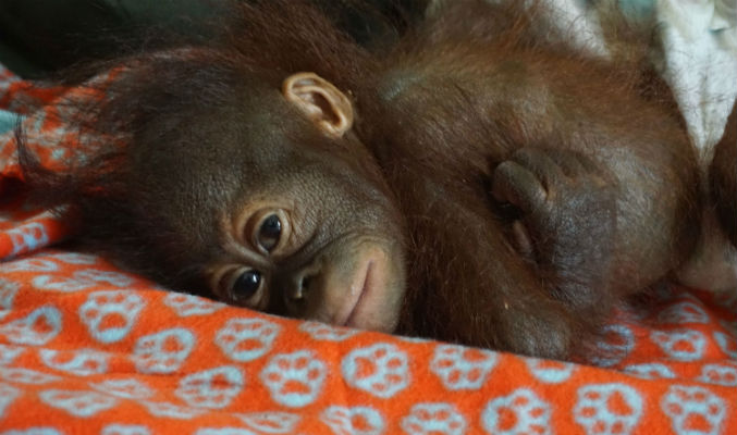 Der acht Monate alte Orang-Utan-Junge lebte bis zu seiner Beschlagnahmung als Kinder-Ersatz bei einem Ehepaar in einem Dorf in der Nähe von Sepuluh (Ostkalimantan). Laut Angaben des Paares wurde er neben seiner toten Mutter in einer Palmölplantage aufgefunden. Er ist das erste Waisen-Baby, das in die Orang-Utan-Waldschule einziehen darf. Der Kleine wurde von einer Vier Pfoten Tierärztin gründlich untersucht und wird nun von einem Team von Tierpflegern liebevoll versorgt und aufgepäppelt.
