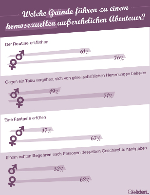 *Online-Umfrage von "gleeden.com", die bei 2'818 weiblichen und 2'901 männlichen Mitgliedern durchgeführt wurde, welche angegeben haben, auf der Suche nach einem homosexuellen Abenteuer zu sein.