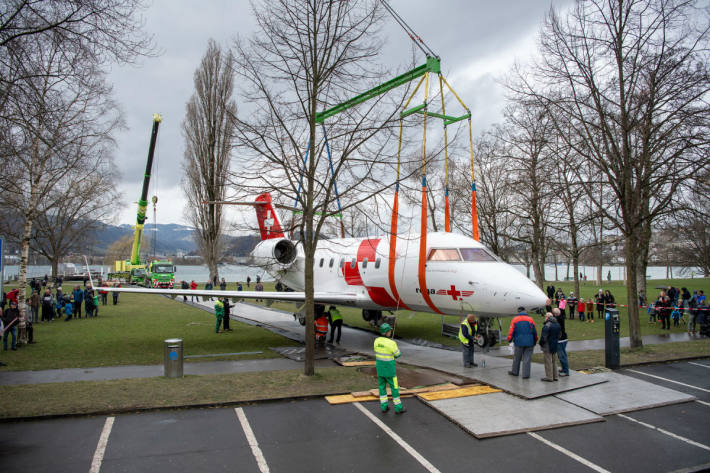 Die Fähre mit dem Ambulanzjet wird am Freitag 8. März 2019, 11:30, beim Verkehrshaus eintreffen. Anschliessend wir der Jet umgeladen und auf Säulen ausgestellt. Die Bevölkerung ist dazu herzlich eingeladen.